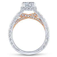 Elegantly crafted in 14K pink and white gold, the Gabriel & Co. Crown Straight Engagement Ring exudes timeless sophistication. With a total carat weight of 0.34, this exquisite setting awaits the perfect center stone to complete its regal allure.