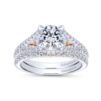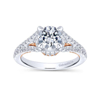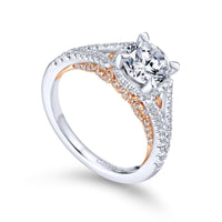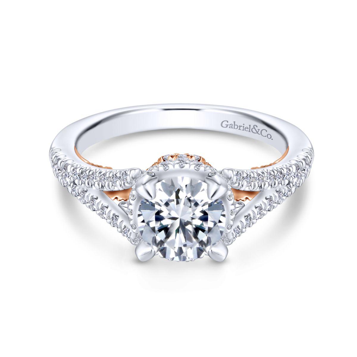Elegantly crafted in 14K white and rose gold, this Gabriel & Co. engagement ring features an infinity split shank design. With a total carat weight of 0.69, this timeless piece is the perfect setting for your center stone.