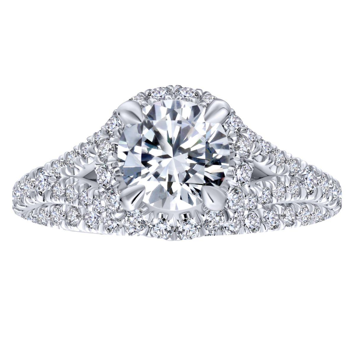 Elegantly crafted in 14k white gold, the Gabriel & Co. Entwined Halo Engagement Ring exudes timeless sophistication. With a total carat weight of 0.69, this exquisite setting awaits the perfect center stone to complete its classic allure.