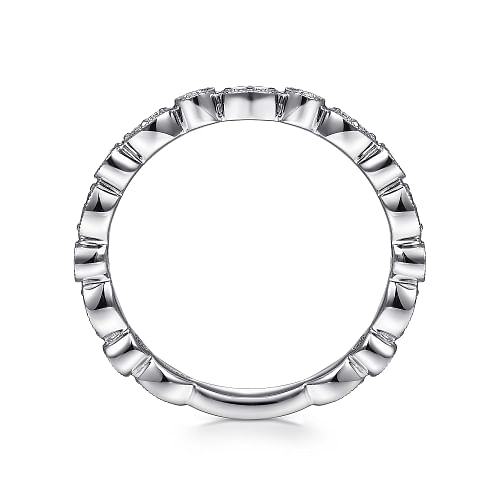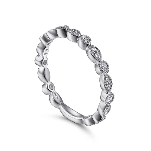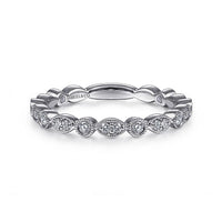 Elegantly crafted in 14K white gold with intricate miligrain edging, this stackable ring features 26 round diamonds totaling 0.24ct. The scalloped silhouette of alternating round and marquise shapes adds a touch of sophistication to this versatile accessory. Perfect for stacking or wearing alone, this ring is a timeless addition to any jewelry collection.