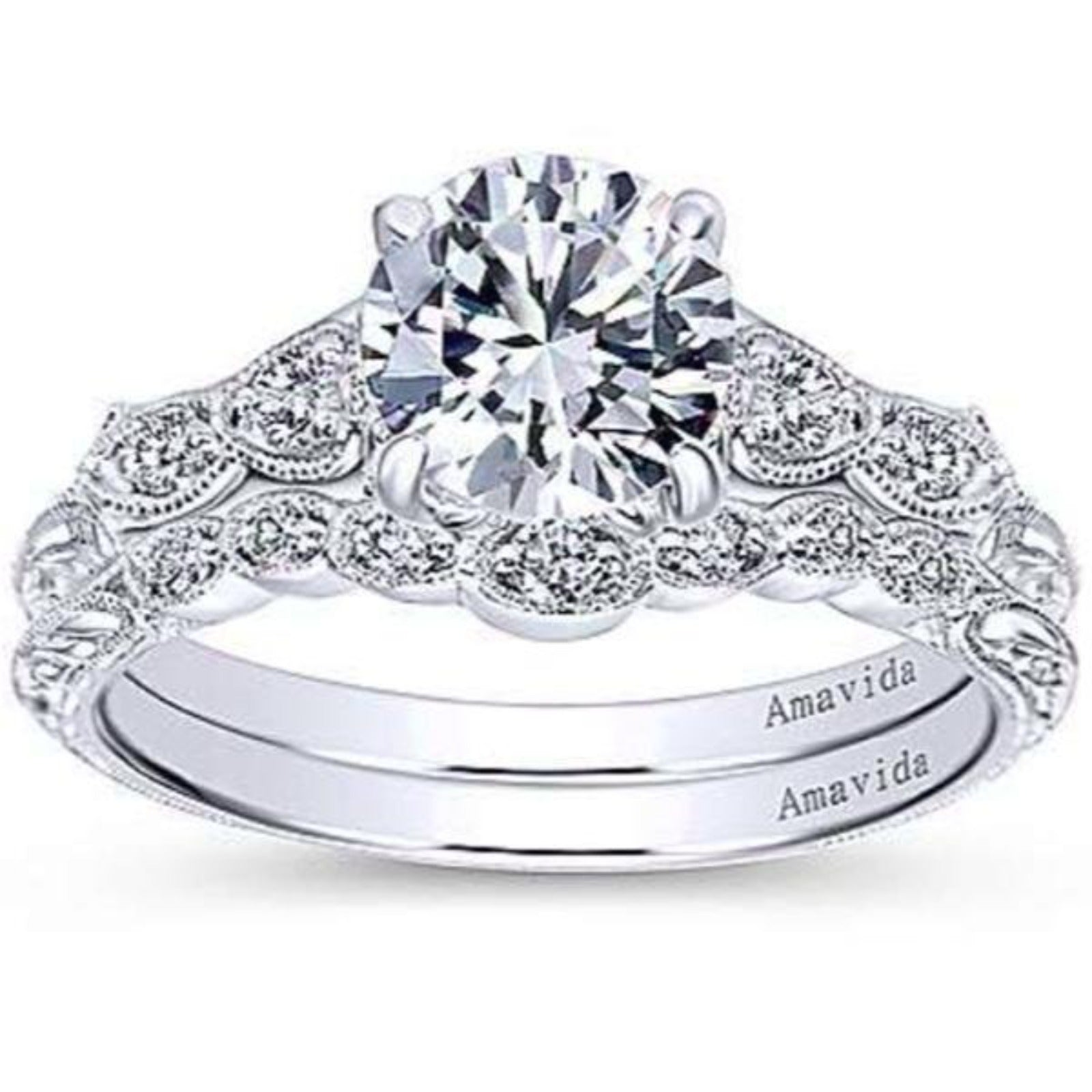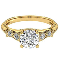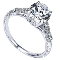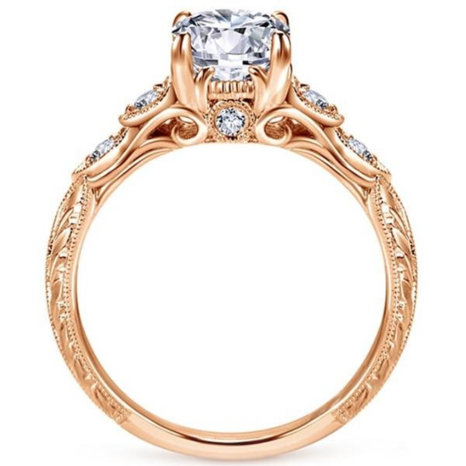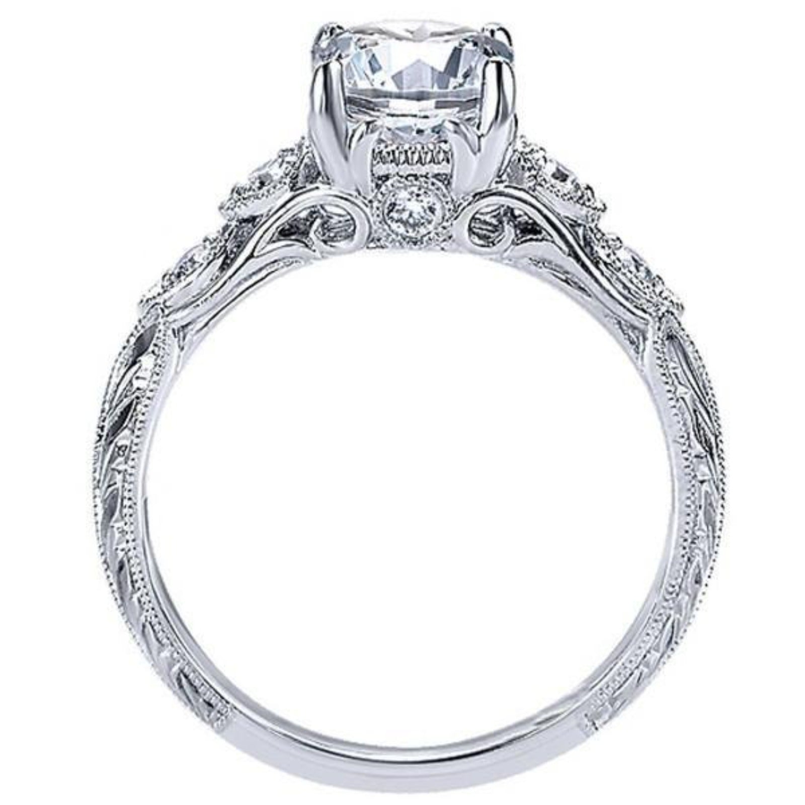 Indulge in the timeless elegance of this vintage-style diamond engagement ring by designer Gabriel. Featuring a round cut center diamond and 0.15 carats of accent round-cut diamonds in milgrain frames, this ring exudes old-world charm. The engraved knife edge band, scroll detailing, and peek-a-boo side diamond add to its exquisite beauty. Customize this stunning ring with your choice of diamond or moissanite, colored gemstone, and metal setting for a truly unique piece. Includes ring box and jewelry appraisal.