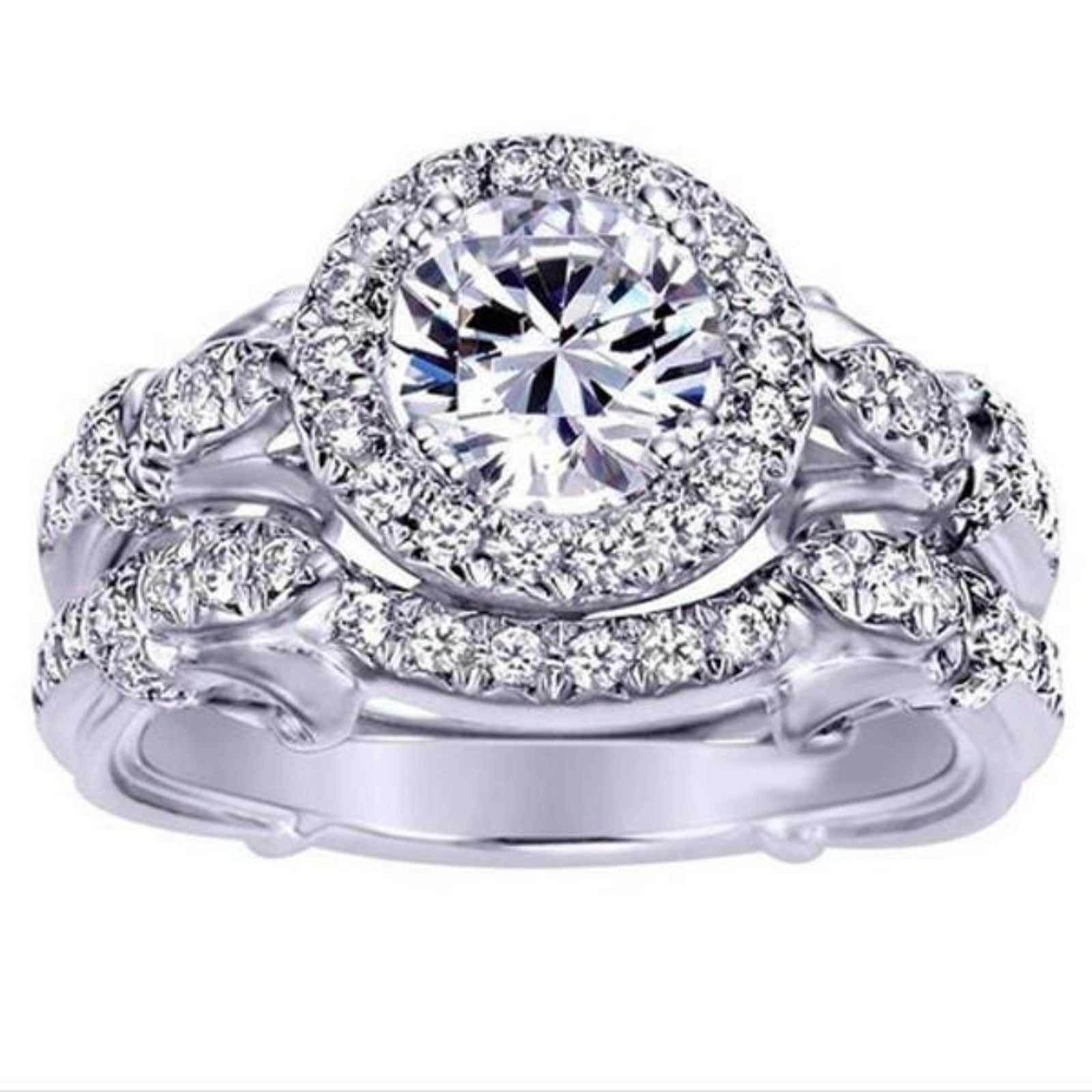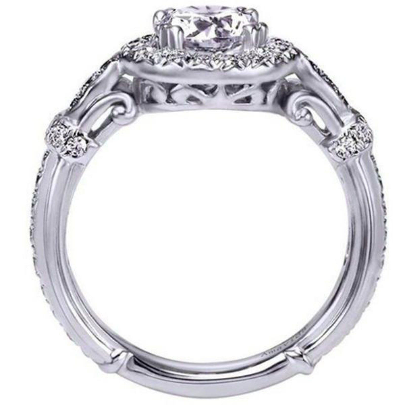 Step back in time to the opulent Art Deco era with this stunning halo-style engagement ring from Gabriel & Co. Featuring a total diamond weight of 0.50 carats, each diamond boasts a quality grade of D4 (G-H Color / SI2 or higher). The intricate scrollwork and vintage-inspired design exude the glamour and sophistication of the Art Deco period. Combining timeless elegance with modern craftsmanship, this exquisite ring is the perfect choice for those who appreciate the allure of vintage aesthetics. Make a statement of enduring love with this captivating Art Deco-inspired engagement ring from Gabriel & Co.