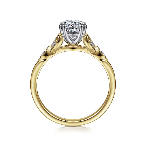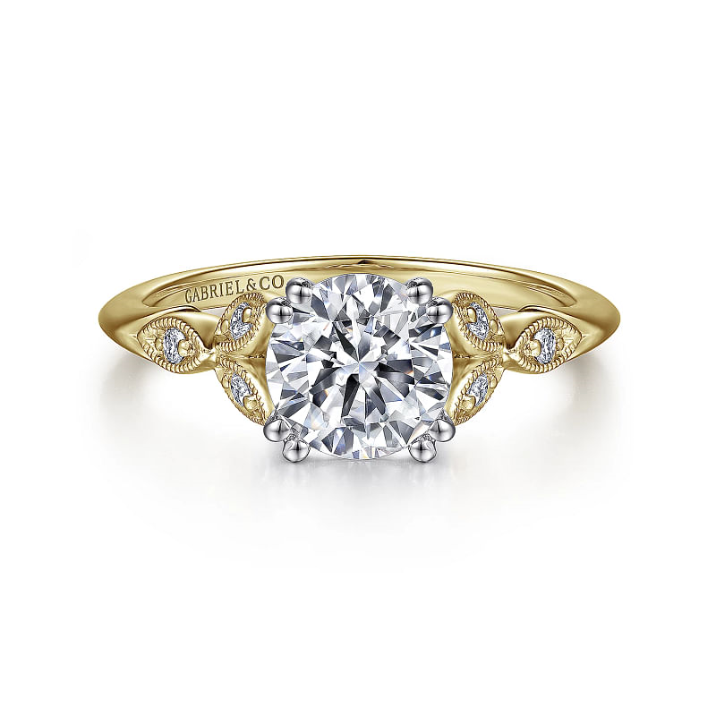 Indulge in the romance of a fairytale wedding with this exquisite round engagement ring featuring Victorian style detailing. Crafted in 14K white gold, delicate diamond and milgrain petals on each shoulder add a touch of sparkle and elegance. The sculpted shank of polished 14K yellow gold completes the look, making this ring a true symbol of everlasting love. Center stone not included in price.