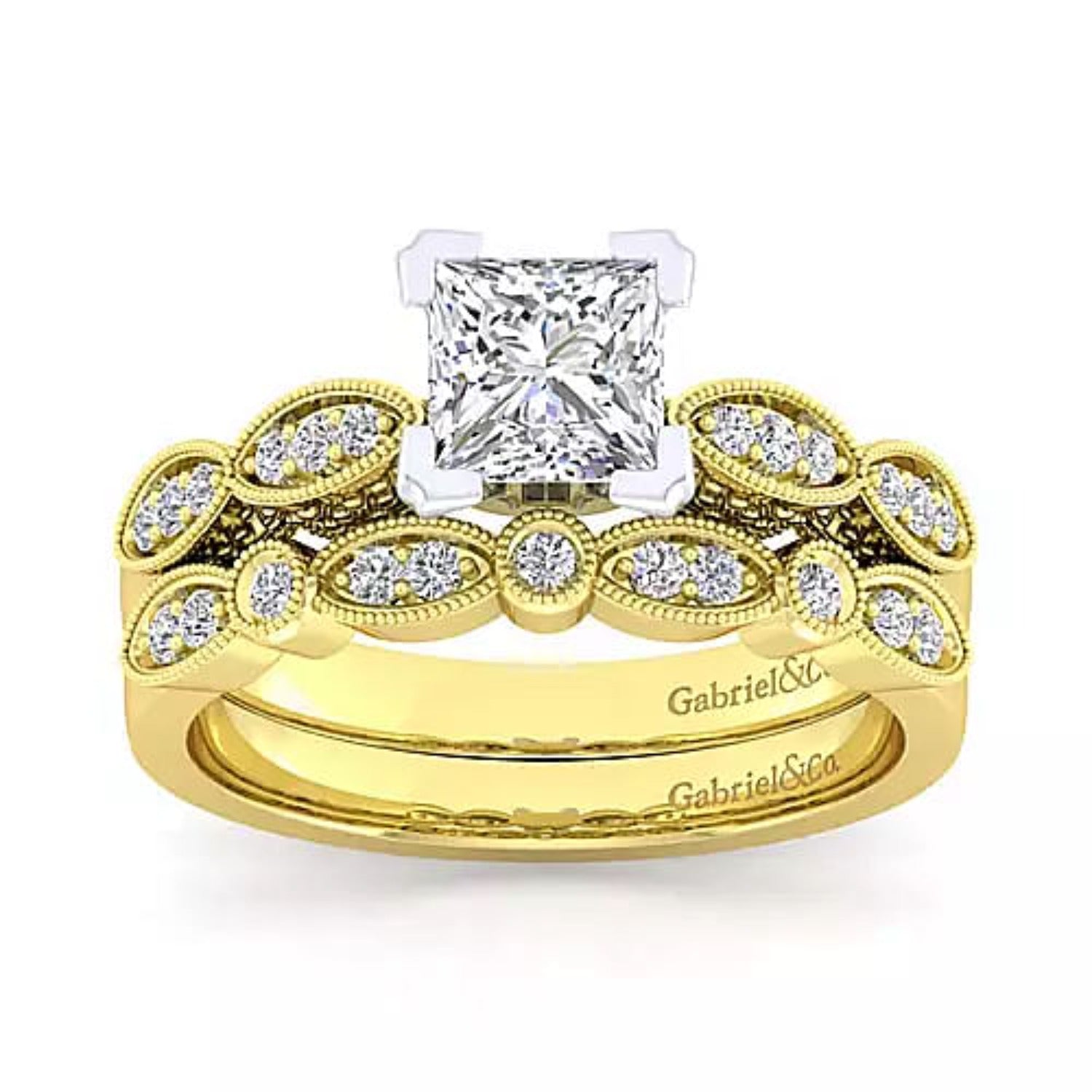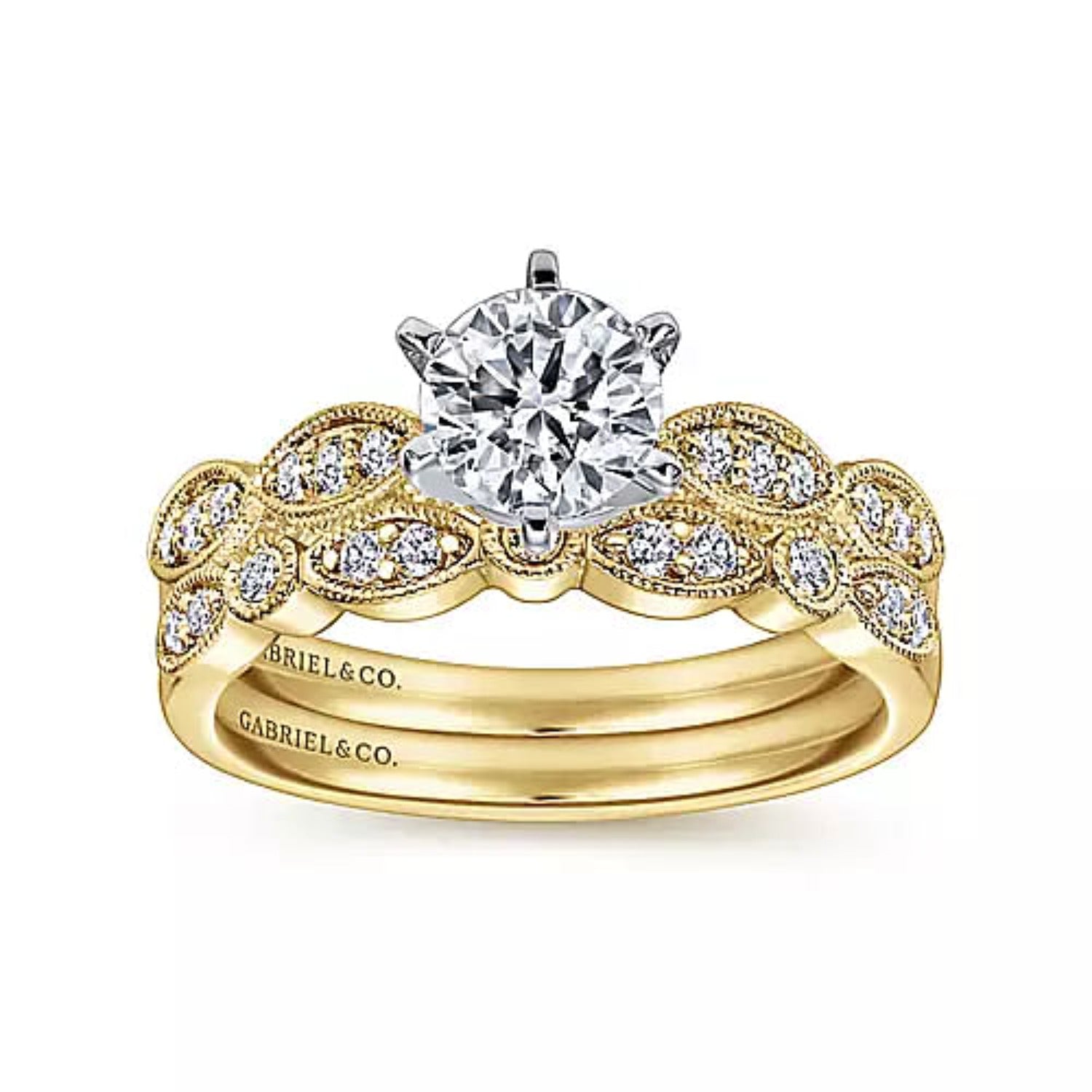 Indulge in the vintage charm of the Gabriel "Clara" Diamond Engagement Ring, adorned with 0.11 carats of dazzling round-cut white diamonds and intricate milgrain accents. This timeless piece exudes sophistication and everlasting love, embodying classic beauty in a refined, elegant design. Available in 14K white, rose, or yellow gold, as well as 18K and platinum, with options for two-tone and three-tone variations. Each ring comes with a ring box, jewelry appraisal, and full insurance for secure delivery, making it a perfect symbol of enduring commitment and exquisite taste.