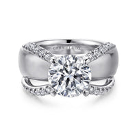 Indulge in the timeless beauty of the Gabriel & Co. Contemporary Wide Band Ring, featuring a stunning total diamond weight of 0.40 carats. This exquisite piece showcases four strands of gold and pave diamonds leading to a captivating round-cut center stone. Crafted with precision and elegance, this ring from Gabriel & Co.'s Contemporary Collection boasts quality D4 diamonds for unparalleled brilliance. Available in various metals and customizable to fit any center stone, this ring is a true symbol of sophistication and luxury.