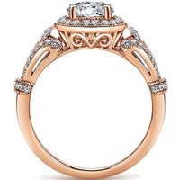 Experience the timeless beauty of the Gabriel "Delilah" Vintage Style Diamond Halo Engagement Ring, a stunning masterpiece that seamlessly blends vintage charm with modern elegance. Featuring a 1-carat round center stone surrounded by a cushion-shaped halo adorned with 0.42 carats of dazzling white diamonds, this ring exudes sophistication and glamour. The split shank is delicately encrusted with 0.39 carats of pav������ diamonds, while meticulous milgrain detailing adds a touch of old-world charm. Symbolizing enduring love and devotion, this ring is a true work of art that will captivate hearts for generations to come.