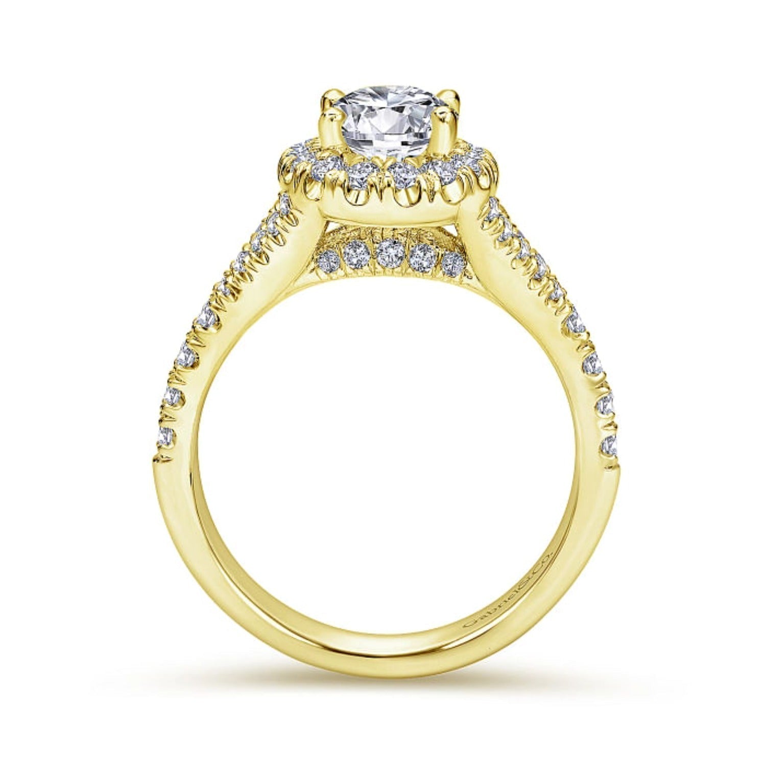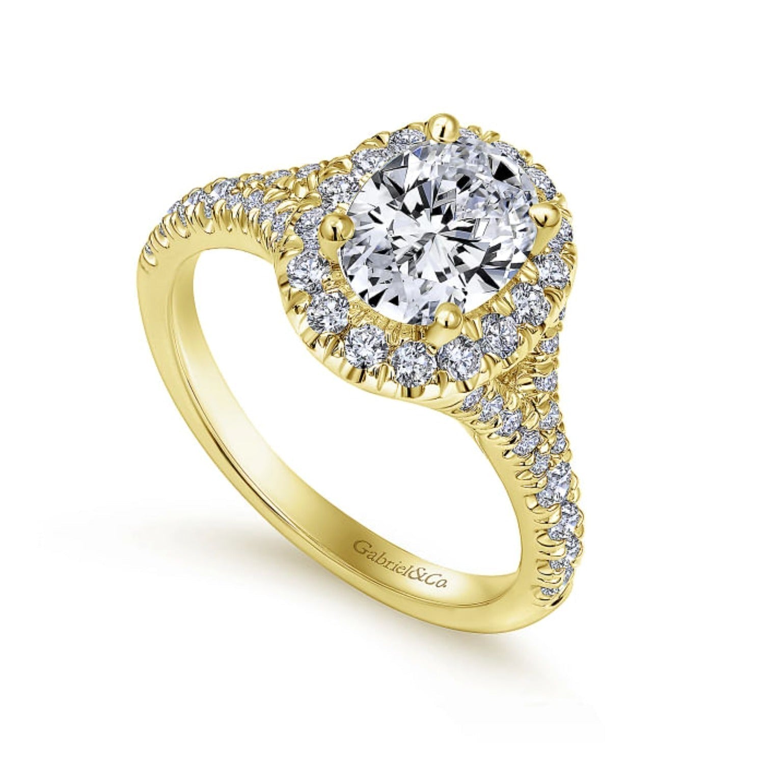 Experience the timeless elegance of the "Kennedy" oval halo diamond engagement ring by Gabriel & Co. Featuring 0.71 carats total weight of carefully selected round cut diamonds, this exquisite piece symbolizes true love and commitment. The tapered double split shank beautifully enhances the diamonds, creating a delicate and classic design. Available in 14K or 18K white, rose, or yellow gold, platinum, and palladium, with customization options to suit your preferences.