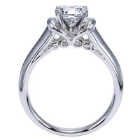 Indulge in the timeless elegance of the Gabriel "Lenora" High Polish Solitaire Diamond Engagement Ring, a mesmerizing piece from the Eclipse Collection. Crafted with a luminous white gold band that gracefully embraces the center stone, this ring exudes sophistication and romance. Intricate side scrollwork details elevate the classic solitaire design, showcasing Gabriel & Co.'s dedication to creating symbols of enduring love. Available in 14K or 18K white, rose, or yellow gold, platinum, and palladium, this ring can be customized to reflect your unique love story. Make a statement of eternal commitment with the "Lenora" solitaire engagement ring, a true masterpiece of craftsmanship and beauty.