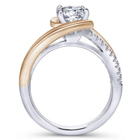 Indulge in the exquisite beauty of our modern yet timeless engagement ring. Crafted with strands of elegant white and rose or yellow gold, this ring gracefully spirals around a brilliant round center stone, accented with 0.15 carats of intricately cut side diamonds. Available in 14K and 18K gold as well as platinum, this heavenly match can be customized to accommodate any size or shape diamond, moissanite, or gemstone. Each ring comes with a ring box, jewelry appraisal, and ships fully insured to your desired location. Experience luxury and elegance with this stunning piece from Gabriel.