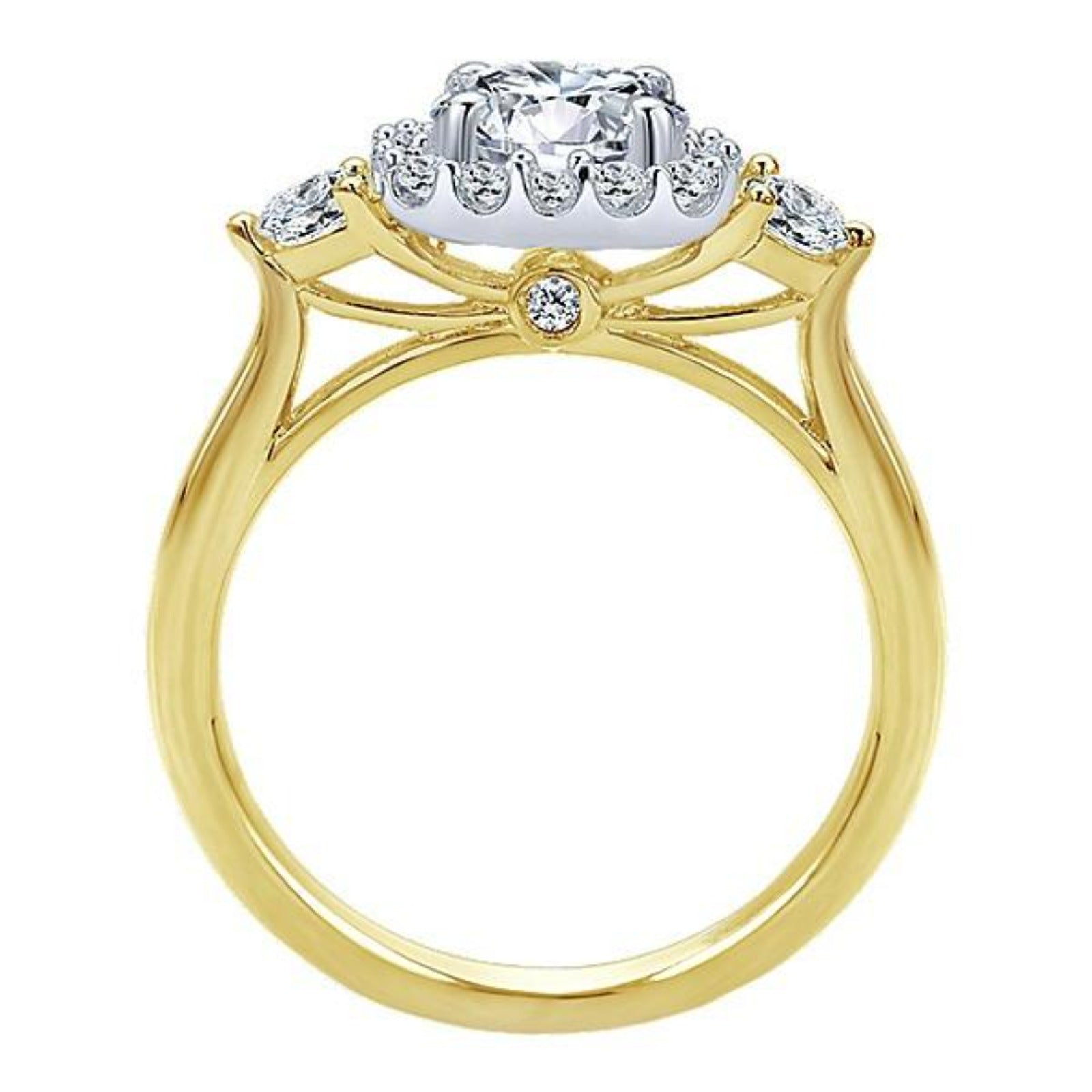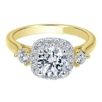 Elegantly crafted by Gabriel & Co., the "Martine" Three Stone Cushion Halo Diamond Engagement Ring exudes timeless romance. With a total weight of 0.52 carats of round-cut diamonds, this ring is a symbol of enduring love and commitment. The vintage-inspired cushion halo design adds a touch of elegance, making it a radiant expression of your unique love story. Available in 14K or 18K white, rose, or yellow gold and platinum, this ring can accommodate any size or shape diamond, allowing for full customization to suit your preferences.
