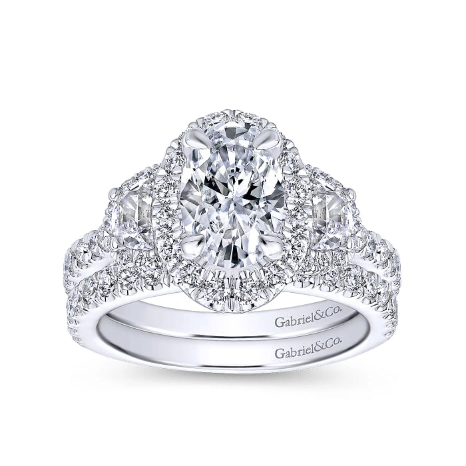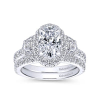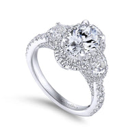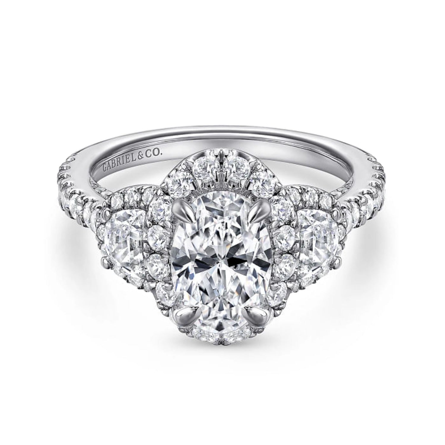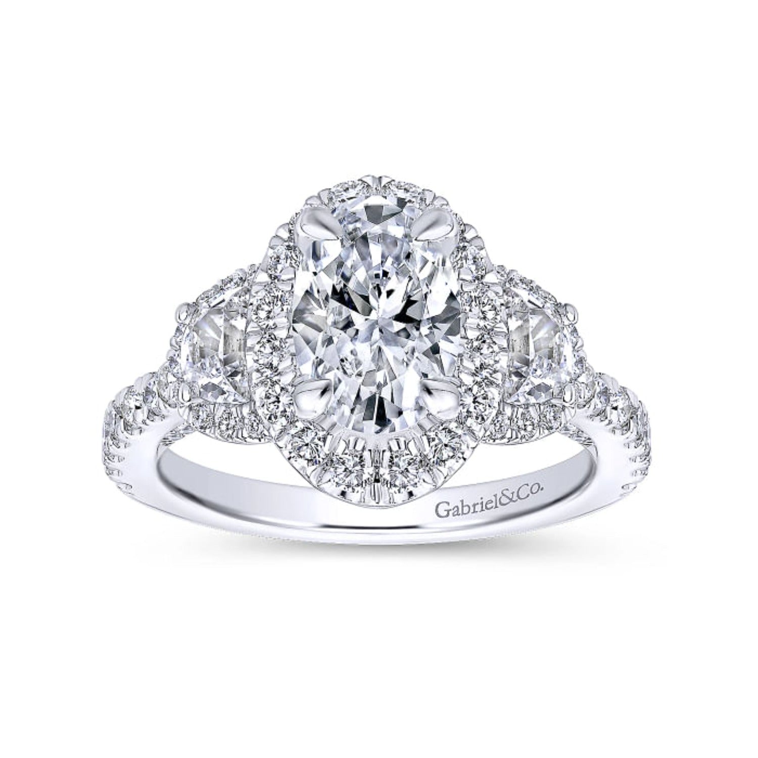 Elevate your love story with the Gabriel & Co. "Waltz" Diamond Engagement Ring, featuring an exquisite oval cut center stone surrounded by a halo of sparkling diamonds. The daring combination of half moon and round cut diamonds totaling 1.56 carats ensures this ring will make a statement. Available in 14K or 18K white, rose, or yellow gold, platinum, and palladium, with customization options for size, shape, and metal. Embrace the risk and discover the beauty of this captivating piece, shipped fully insured with a ring box and jewelry appraisal included.
