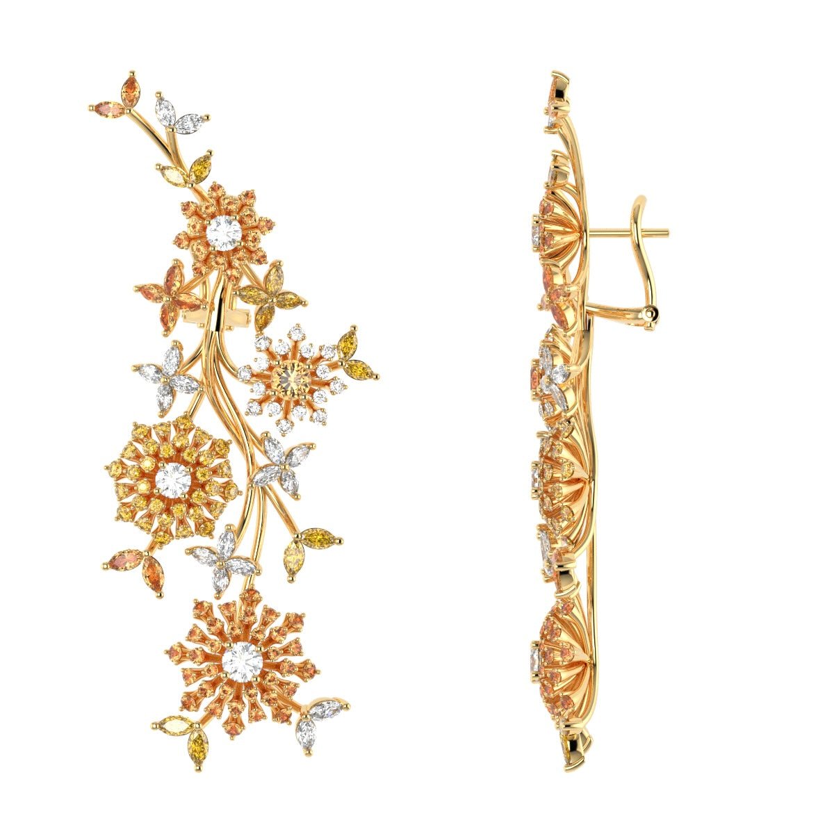 Inspired by The Met Gala's Garden of Time theme, these stunning earrings feature an intricate, floral design adorned with sparkling white diamonds amidst brilliant orange and yellow sapphires.