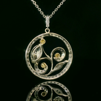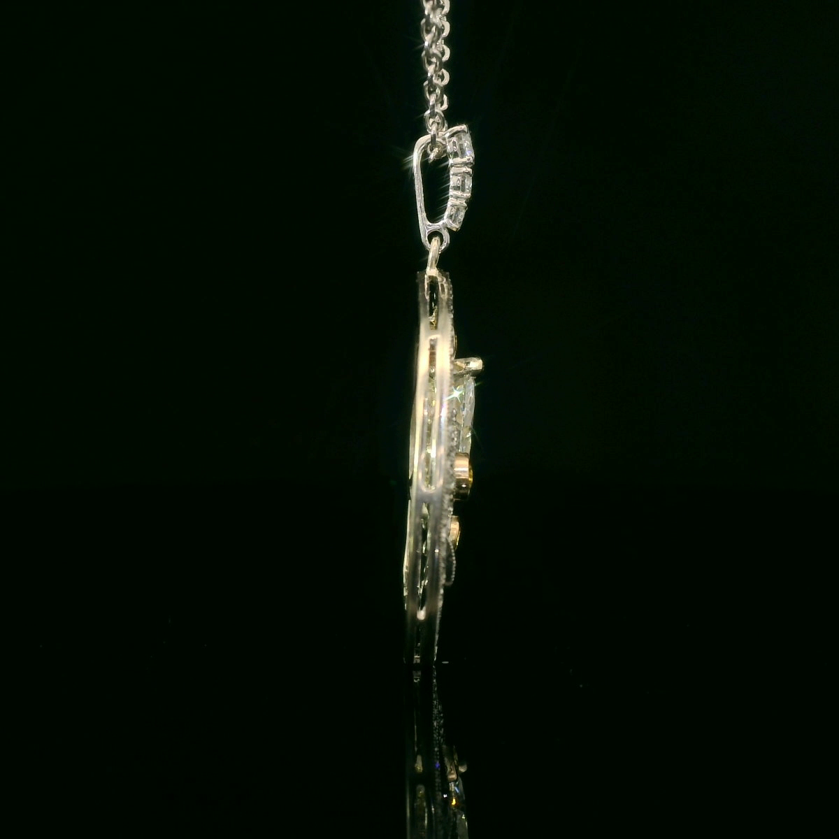 This stunning pendant features intricate swirling designs adorned with sparkling diamonds. The combination of yellow and white diamonds creates a captivating contrast, making it a perfect accessory for any occasion. Elevate your jewelry collection with this exquisite piece that embodies elegance and sophistication.