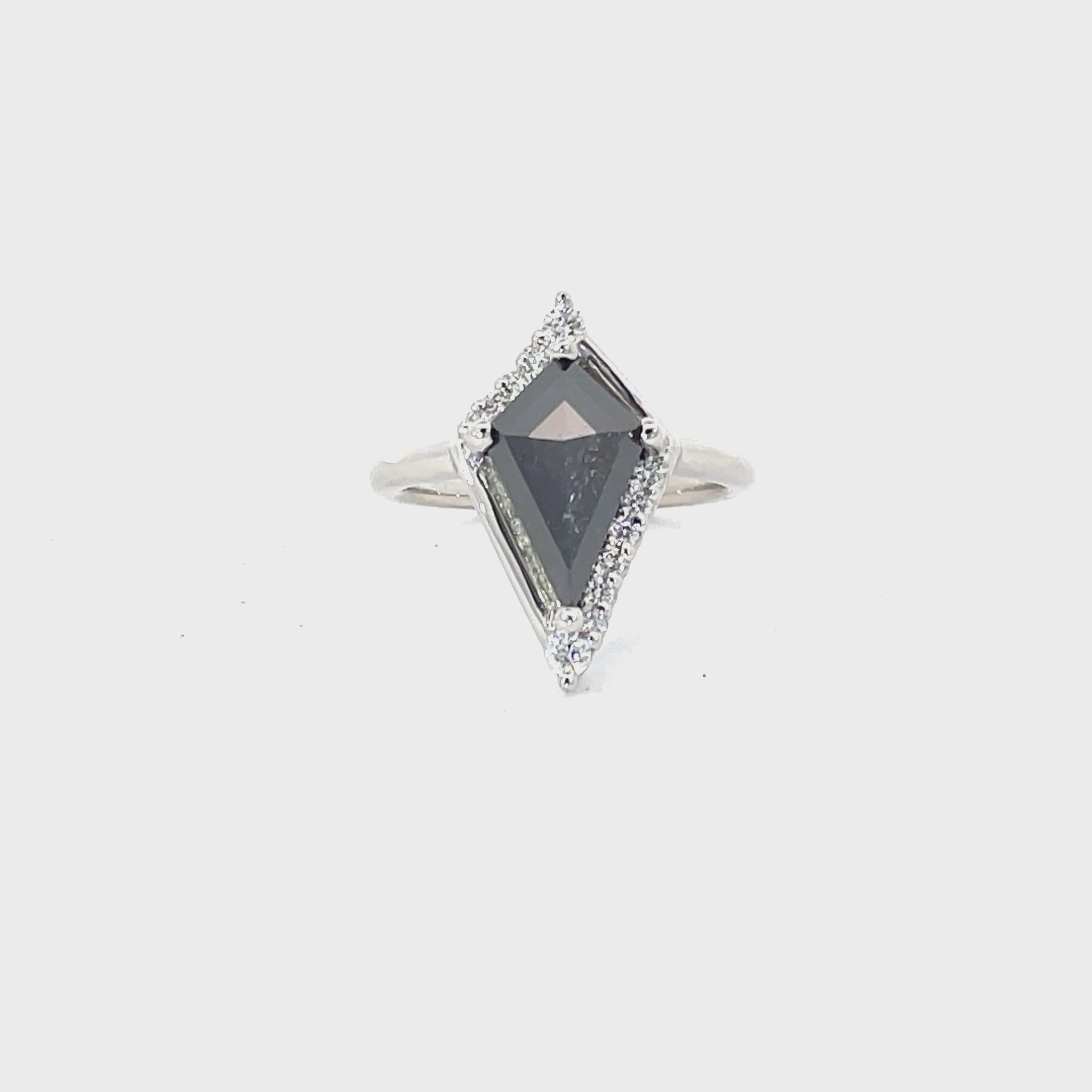 This exquisite ring features a striking Kite-shaped black diamond, elegantly framed by a halo of sparkling white diamonds. Set on a sleek white gold band, this piece exudes sophistication and modern elegance, making it the perfect ring for any occasion.