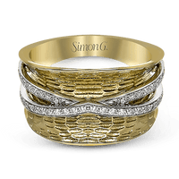 the classic hammered design of this two-tone white and yellow gold ring is accented by twin intertwined ribbons of .30 ctw round white diamonds.
