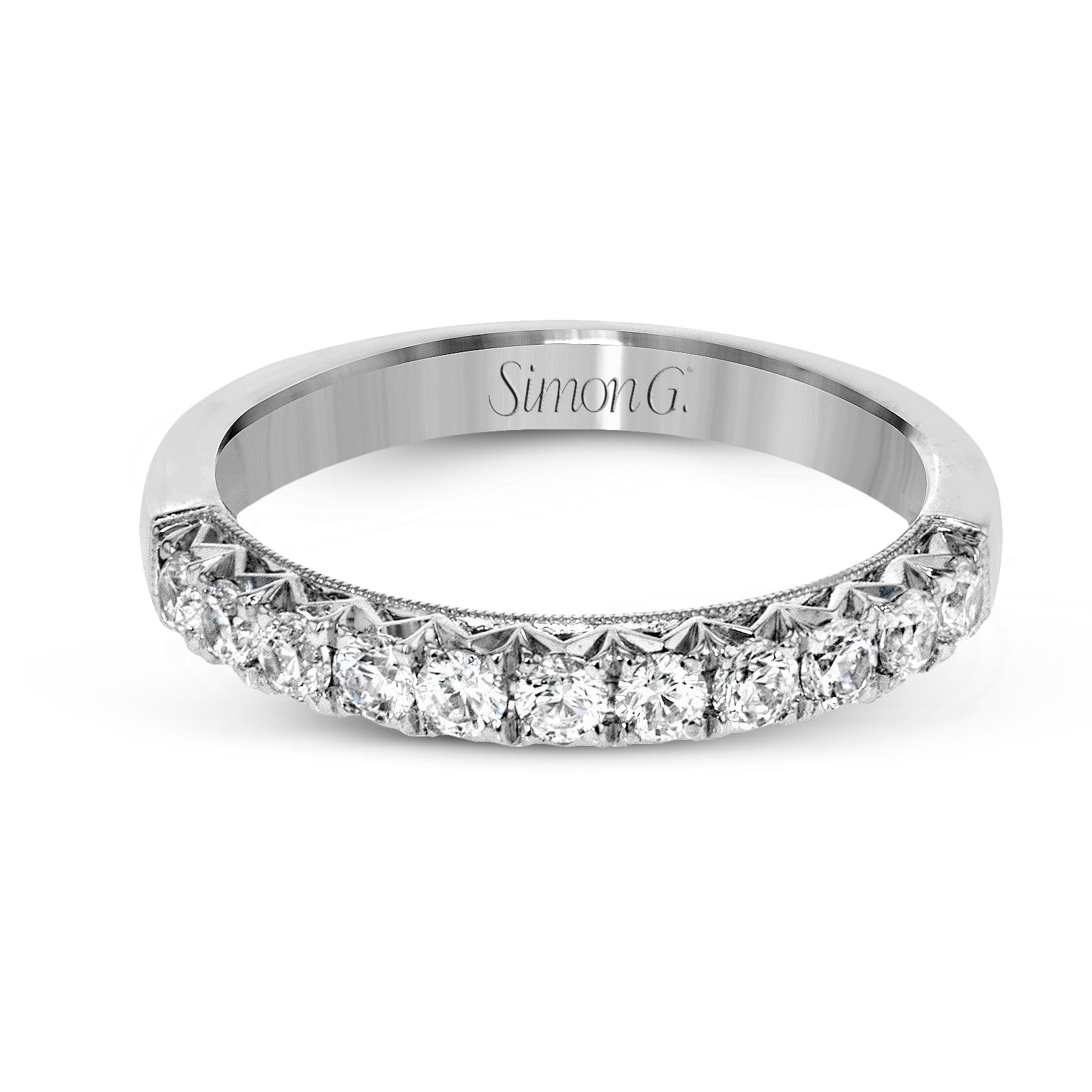 This classic wedding band features brilliant diamonds set in a distinctive, intricate style.