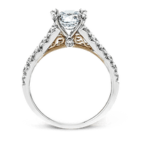 This beautiful engagement ring is adorned with brilliant, graduated diamonds and features a delightful rose gold accent.
