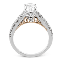 This beautiful engagement ring is adorned with brilliant, graduated diamonds and features a delightful rose gold accent.