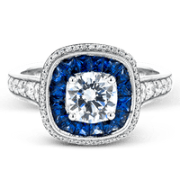 Specially shaped sapphires formed a halo around the center stone in this remarkable engagement ring, accented by .42 ctw of white diamonds as well.