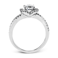 This delicately glamorous engagement ring glitters with .24 ctw of round white diamonds set into its twisted shank and distinctive rippling halo.