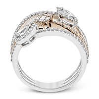 This stylish ring features a unique design that resembles three bands and is adorned with a dazzling combination of round, marquise, princess and baguette diamonds.