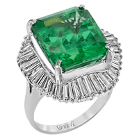 This absolutely stunning ring features a unique, larger-than-life emerald nestled in a halo of sparkling baguette diamonds. It is a dazzling, intricate piece born from the timeless artistry of Simon G.