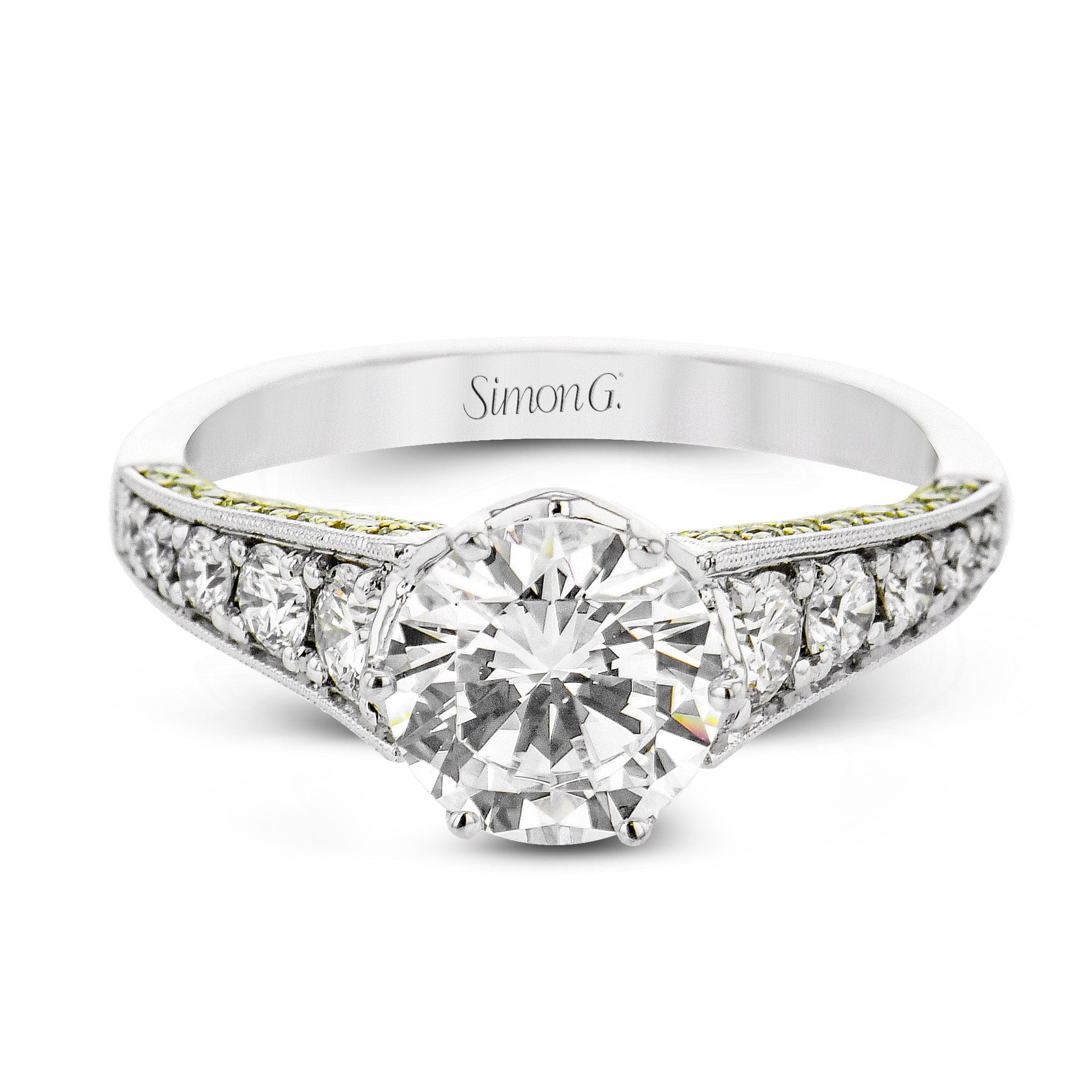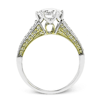 This cathedral-style engagement ring features milgrain detail and sparkles with white and yellow diamonds.