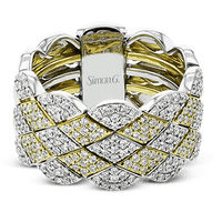 18k two tone contemporary right hand ring consists of 5 interlocking bands to create the look of of a single wide band and has 0.77 ctw of diamonds