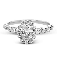 This 18k white gold antique design features a scalloped diamond halo which gives the ring a floral effect, and flush set side diamonds 0.48ctw, made for an oval center stone