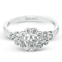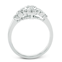 This stunning engagement ring features a cluster design and extended halo that sparkles with half-bezel set diamonds.