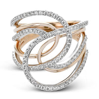 This bold, two-tone ring features intertwining swirls of white and rose gold set with brilliant round diamonds.