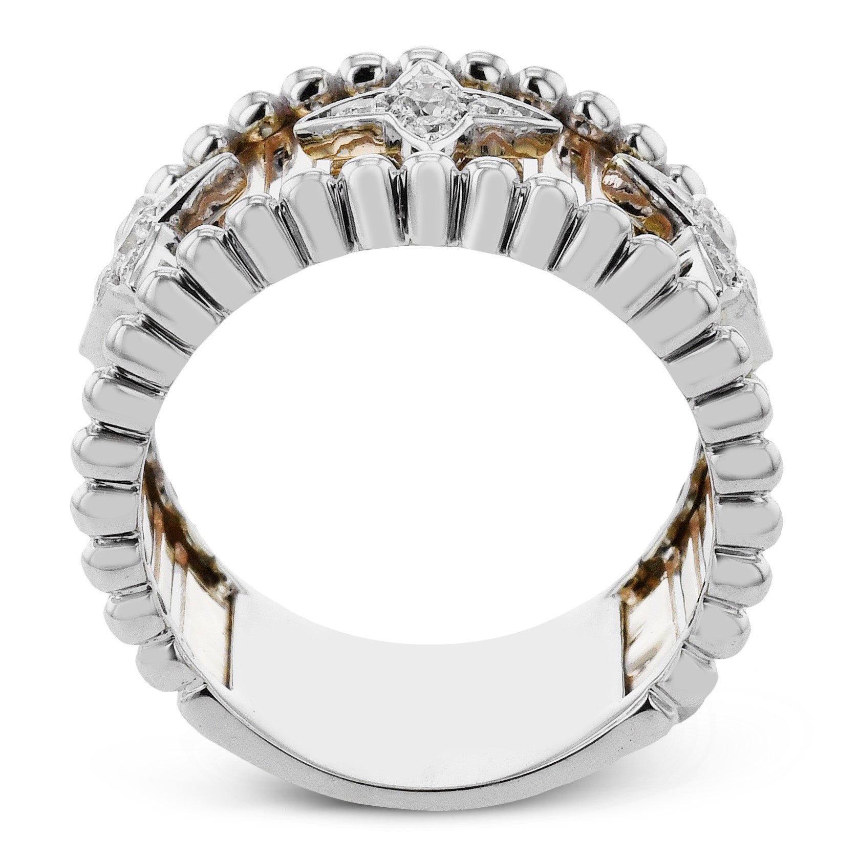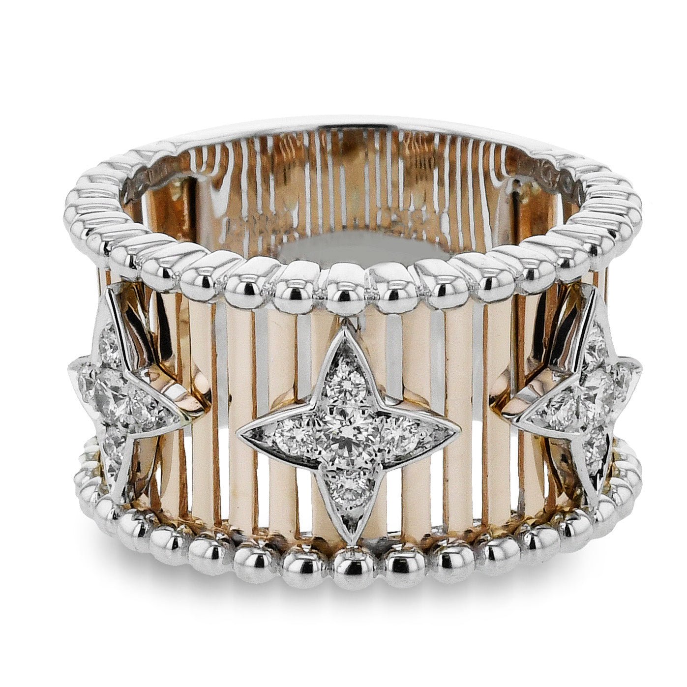 This statement ring features a white gold beaded edge and strands of rose gold adorned with brilliant diamonds set in floral-inspired patterns.