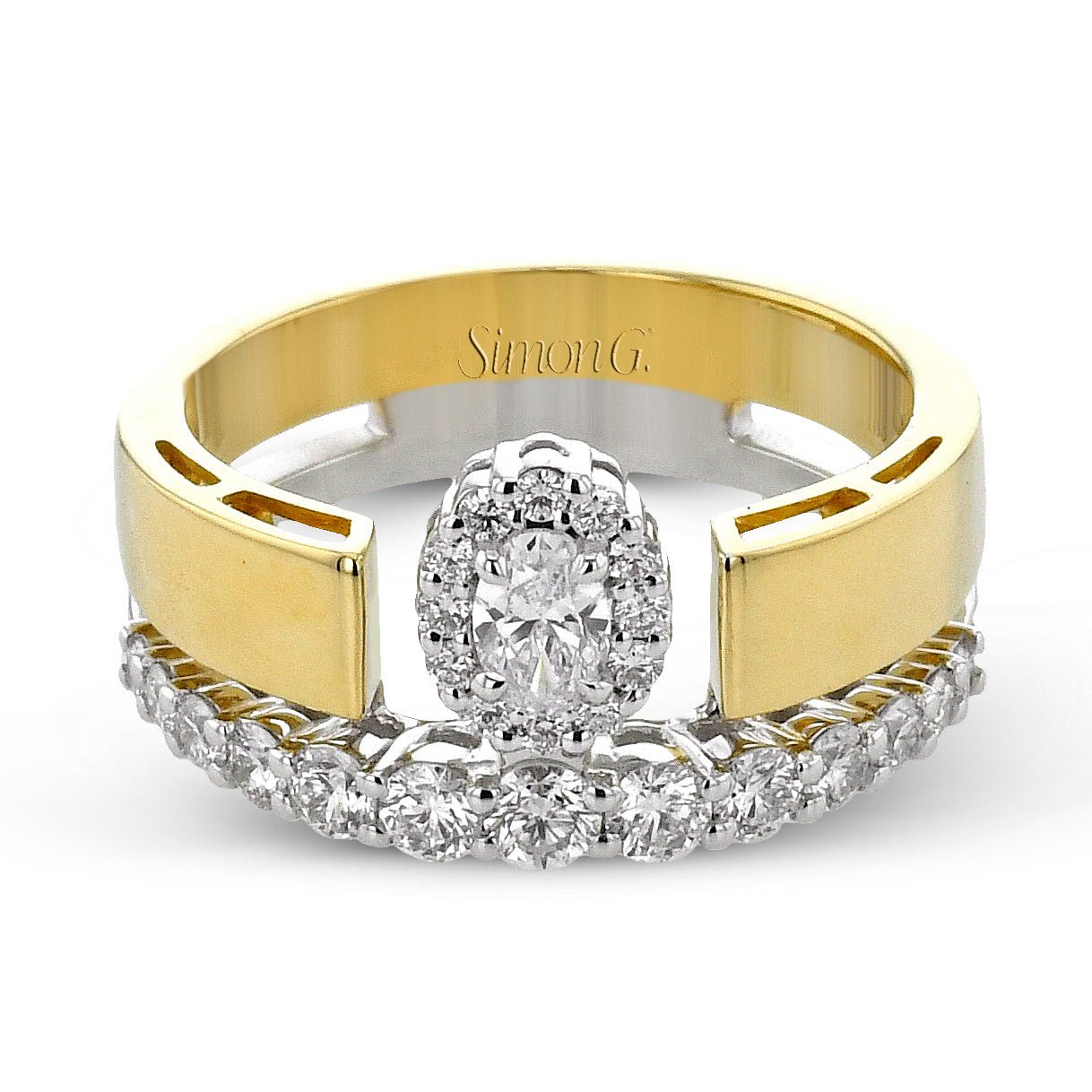 This distinctive, two-tone ring features a delightfully contrasted shank lined with sparkling diamonds as well as a sparkling oval-cut center diamond set in a halo.