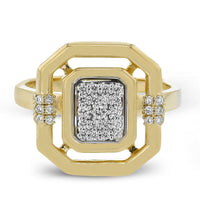 This distinctive ring features a unique, two-tone design and sparkling white diamonds.