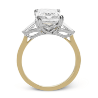 This beautiful engagement ring features a three-stone design with sparkling baguette side diamonds.