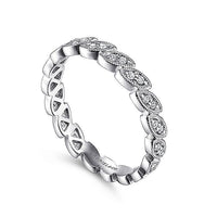 Handcrafted to perfection, this exquisite 14K white gold stackable ring features a 0.17ct diamond array dispersed tastefully around the band. The precious round diamonds are prong set within delicate milgrain-edged marquise shapes creating a unique silhouette.