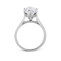 This elegant engagement ring is adorned with a delicate under halo and features sparkling diamonds the side profile under the setting.