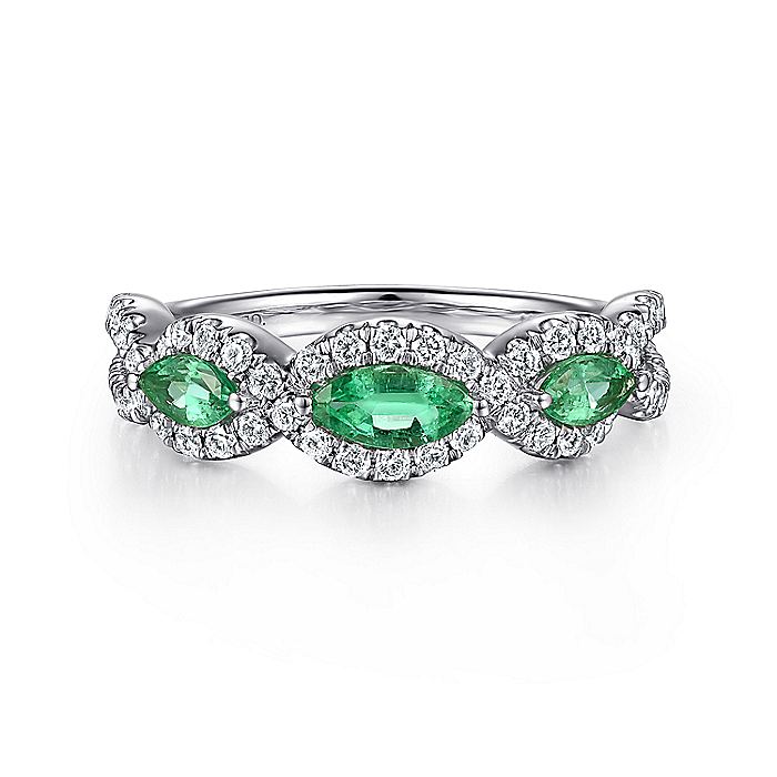 Add striking color and sparkle with this elegant 14K white gold Lusso Color ring. A trio of marquise cut emeralds are set between two twisting strands of luminous 0.45ct pavé diamonds. A vivid and distinctive May birthstone adornment.