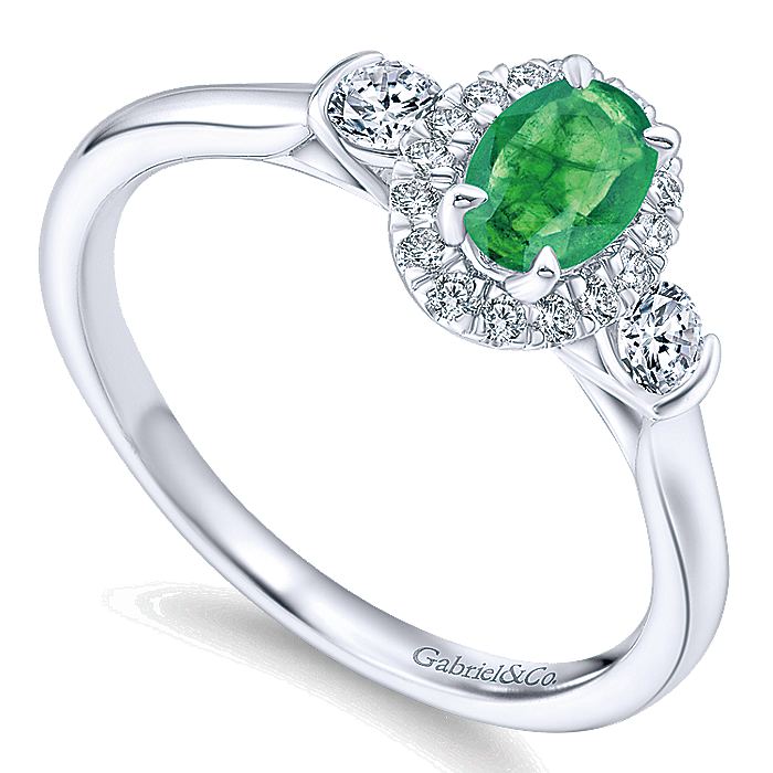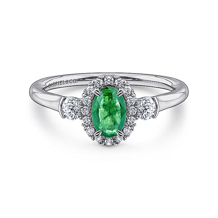 HOME / Gabriel & Co. LR51070W44EA 14K White Gold Oval Emerald and Diamond Halo Three Stone Ring
