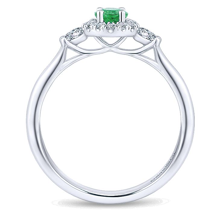 An enchanting 3 stone style Lusso Color ring showcasing an oval cut emerald center stone and a matching pair of round diamond side stones. The vibrant May birthstone is also surrounded by a halo of scintillating pavé diamonds. This 14K white gold and 0.24ct diamond ring is a timeless classic.