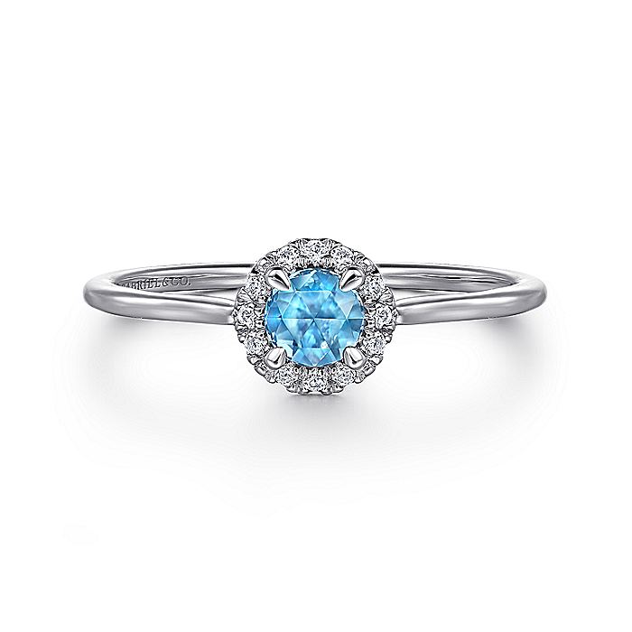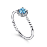 A round cut sky blue topaz with a sparkling diamond halo adorns this feminine fashion ring. Finished with a slim 14K white gold band, this 0.05ct diamond and December birthstone ring is a colorful yet classic everyday accessory.
