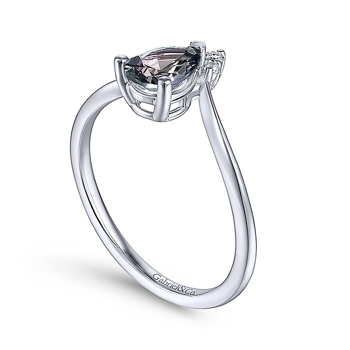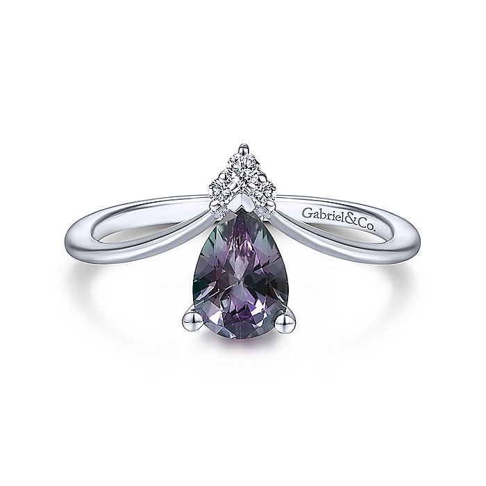 Known for its color changing ability, June birthstone Alexandrite makes for a truly alluring accent. This Alexandrite ring features a graceful pear shaped center stone joined by a brilliant trio of 0.03ct diamonds. The polished 14K white gold band cleverly contours around the gemstone in a sharp V shape.