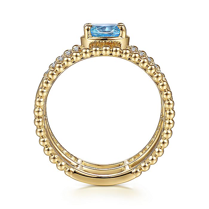Two strands of beaded 14k yellow gold flank a sparkling central band adorned with 0.06cts of breathtaking pavé diamonds. The centerpiece of this fashion ring is an east-west set oval cut swiss blue topaz stone with a serene blue hue. Get your ring stack started with this pre-layered piece.