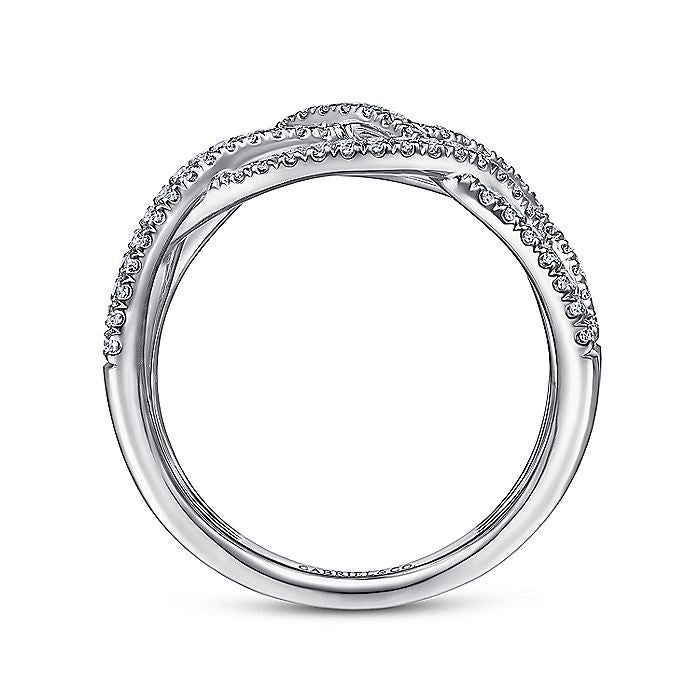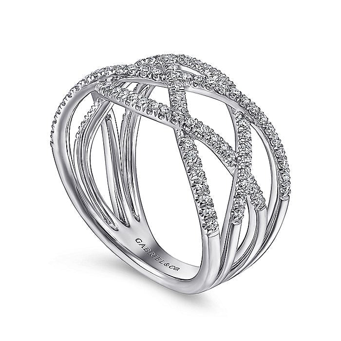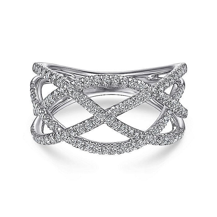 This sparkling and sophisticated fashion ring features an elegant split shank that divides into criss crossing strands, creating a loose grid effect. Constructed in rich 14K white gold and garnished with 0.51cts of dazzling pavé diamonds, this Lusso fashion ring is an indelible favorite.
