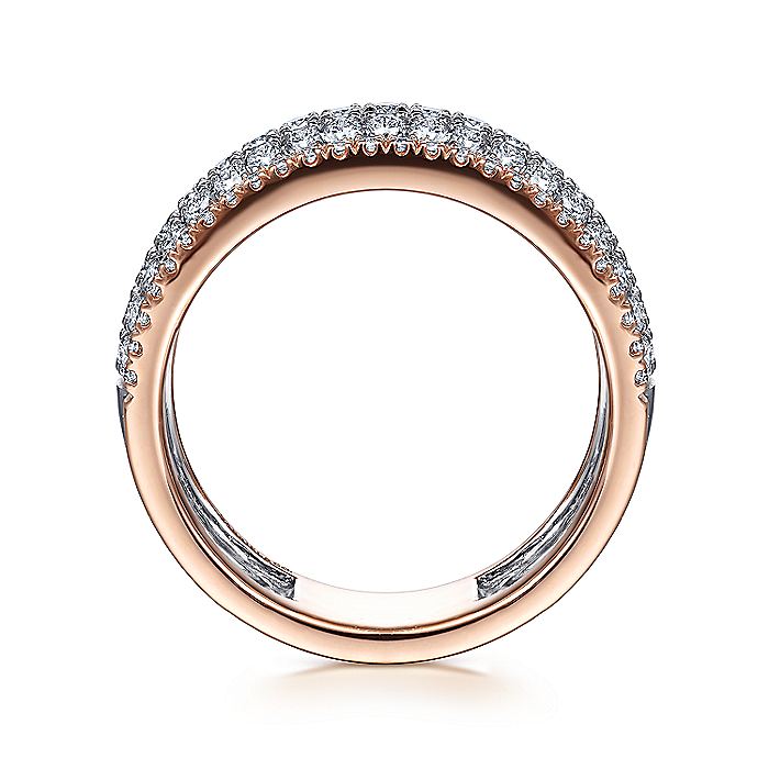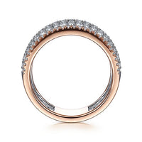 This two tone style flawlessly unifies a central swath of 14K white gold between two slim 14K rose gold borders. Sumptuous 1.04ct pavé diamonds adorn each layer of this dazzling mixed metal design.