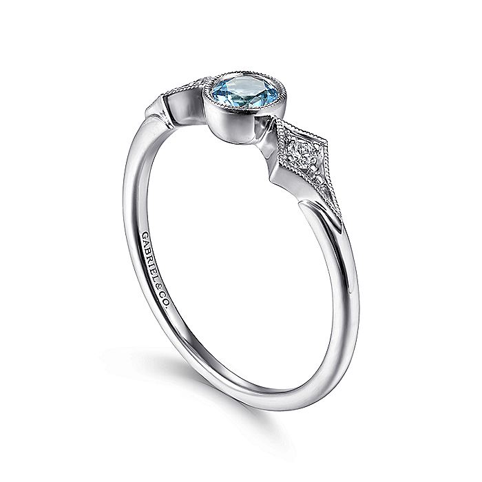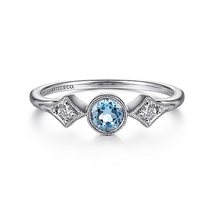 HOME / Gabriel & Co. LR51605W45BT 14K White Gold Round Blue Topaz and Diamond Three Stone Ring