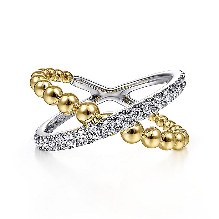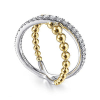 HOME / Gabriel & Co. LR51628M45JJ 14K White-Yellow Gold Bujukan Diamond and Metal Bead Criss Cross Ring in size 10.8mm width