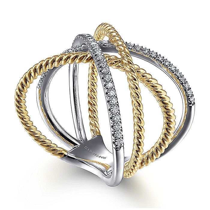 HOME / Gabriel & Co. LR51630M45JJ 14K White-Yellow Gold Twisted Rope and Diamond Criss Cross Ring
