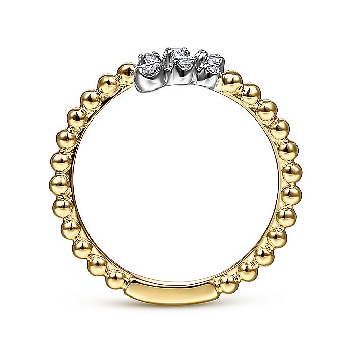 This delicate open wrap ring features the 14K yellow gold beadwork that is the hallmark of our Bujukan collection. Tipped with graduated trios of 0.13ct diamonds set in contrasting 14K white gold, this open wrap ring lends a pop of subtle shimmer to any day or evening look.