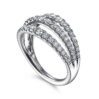 This breathtaking Lusso fashion ring features a split shank - a single band that divides into three distinct rows. Each row is encrusted with a graduated strand of bright round cut diamonds. All told, this 14K white gold ring showcases 0.96cts of diamonds.